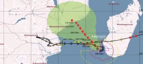 Reads the update in part “Projections maintain a very high chance that FREDDY will return and make a second landfall over Mozambique by Friday.